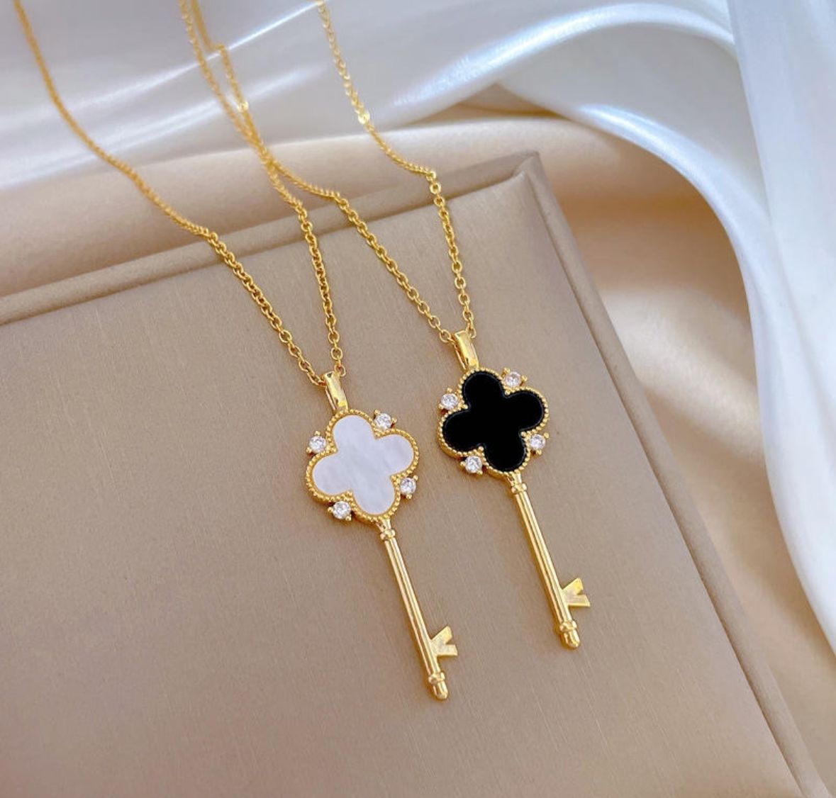 Unlock timeless beauty with the Golden Clover Key Pendant Necklace. Featuring a delicately crafted clover-shaped charm in black and white enamel, framed with sparkling crystals, this pendant rests elegantly on a polished golden chain. The key symbolizes new beginnings and opportunities, while the clover adds a touch of luck and grace. A perfect piece to wear as a statement of elegance or gift to someone special.